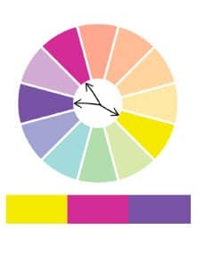 The variation on a complementary colour relationship is called split-complemetary. You start with one hue (colour), then pic the two hues that sit on either side of its complement. This Colour Chord plays off the complementary relationship, creating a lively and slightly clashing colour result.